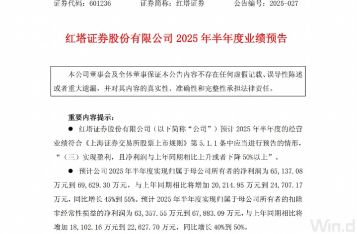 据红塔证券公告,经财务部门初步预算,2025年上半年,红塔证券预计实现归属于母公司所有者的净利润为6.51亿万元到6.96亿元,同比增长45%到55%;预计实现归属于母公司所有者的扣除非经常性损益的净利润为6.34亿元到6.79亿元,同比增长40%到50%。